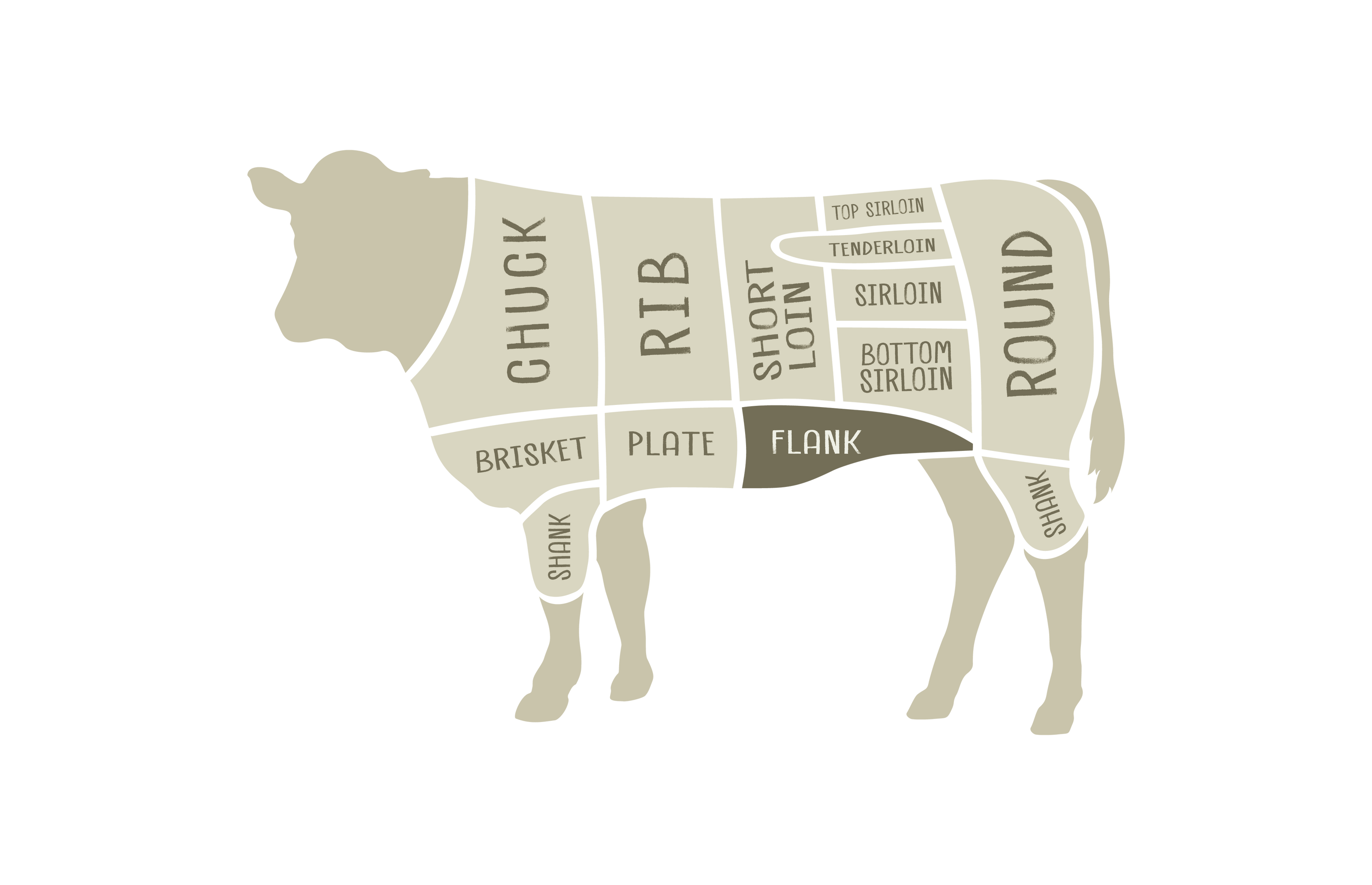 Flank Steak comes from the Flank primal, located on the lower belly. Its long, flat, and has a visible grain structure. It's lean with minimal fat, making it less tender than some other cuts but full of beefy flavor.