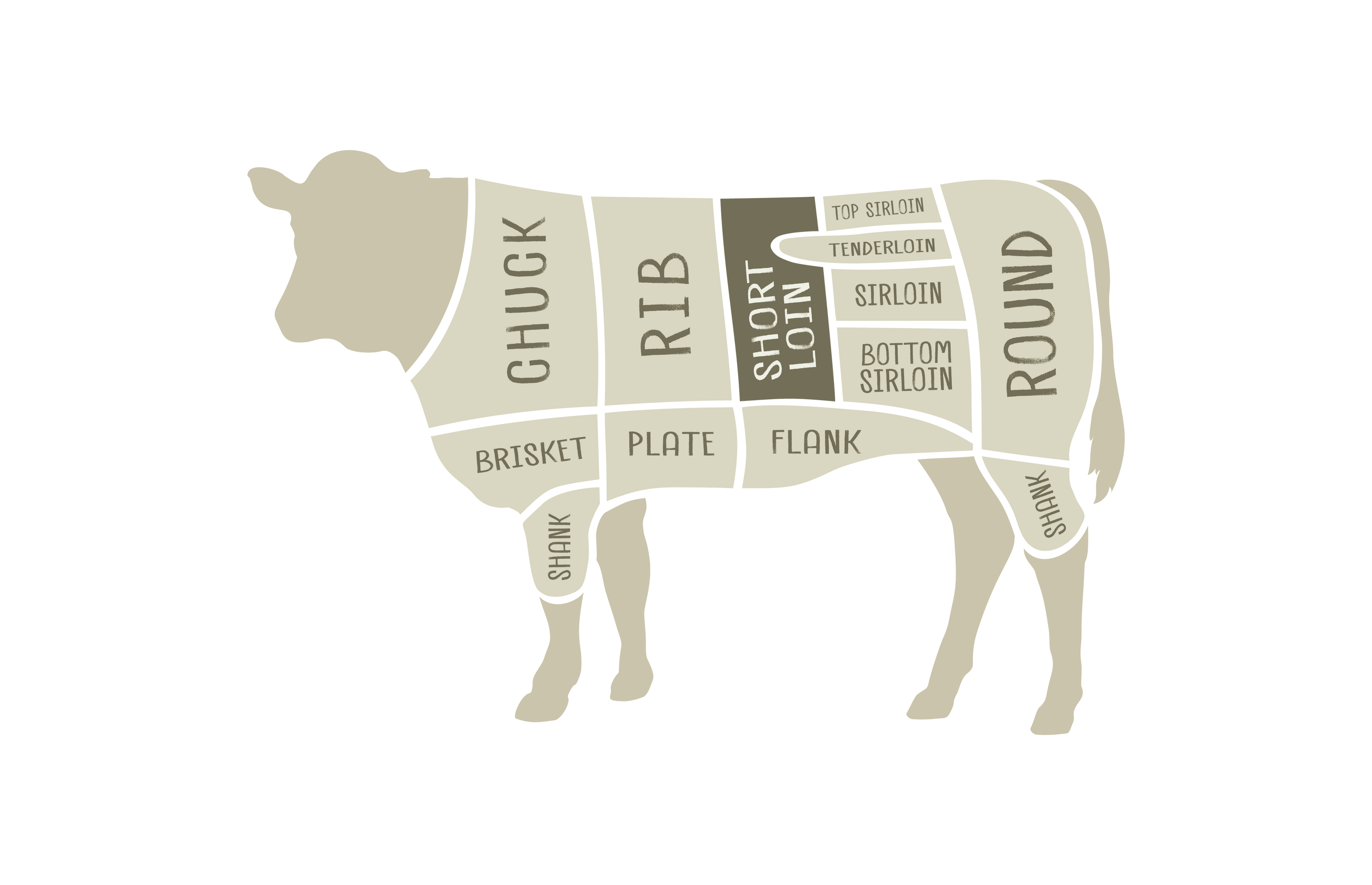 The Porterhouse comes from the short loin, located along the backbone behind the ribs. The Porterhouse is one of the largest and most premium steaks available, prized for its combination of two high-end cuts in one: the tenderloin filet on one side of the bone and the strip steak (New York Strip) on the other. The signature T-shaped bone in the center gives it its classic look and helps conduct heat evenly during cooking. Porterhouses are thicker than T-bones (typically 1.25” or more) and deliver the best of both worlds—rich marbling and delicate tenderness.